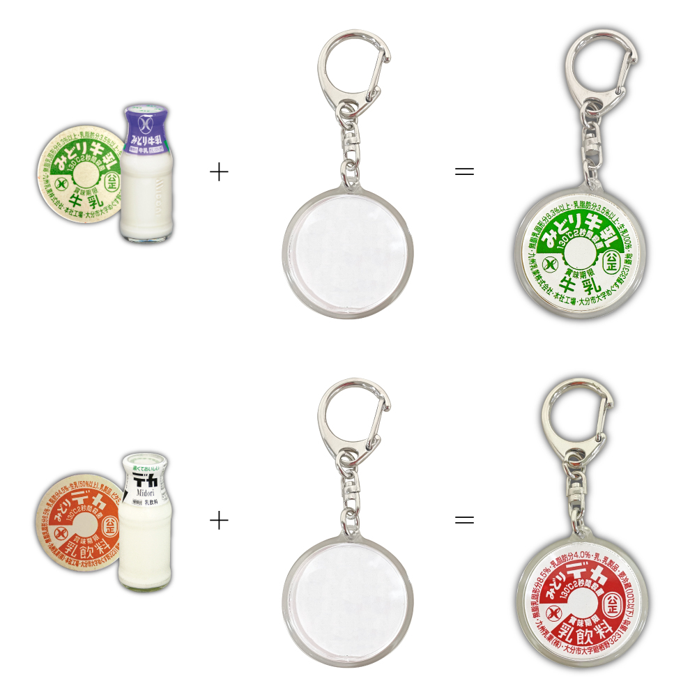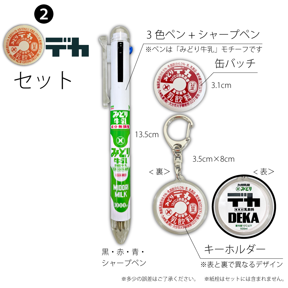 みどり牛乳グッズ 缶バッジ・キーホルダー・ペンセット ※各1つ